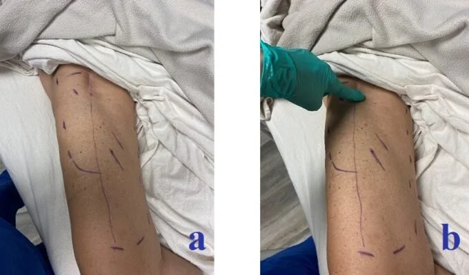 a – Outer dotted line indicates where the patient felt almost full recovery of sensations; the vertical line on the anterior thigh indicates an area where the patient started to feel the return of some sensations; two diagonal lines on the medial thigh indicate an area where the patient was beginning to feel tingling instead of complete numbness.