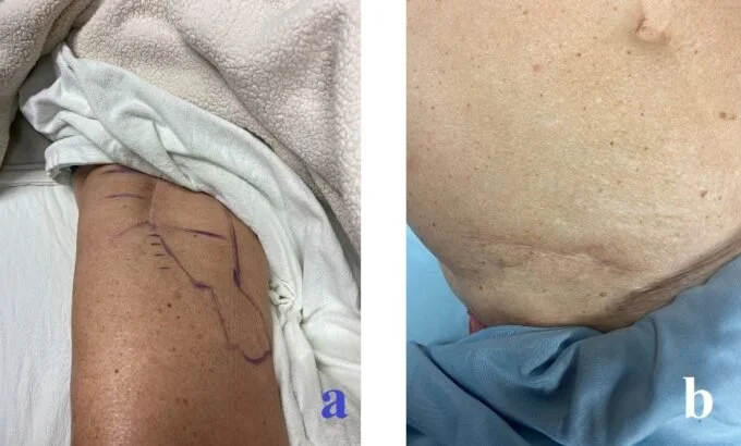 Surgeries were performed with two incisions; one in the lower right quadrant of her abdomen and another in the right upper anterior thigh.
