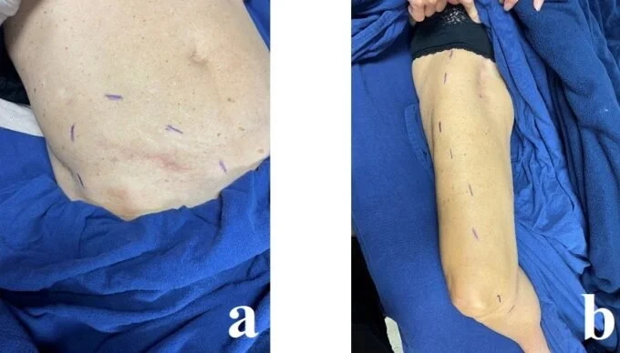 A 64-year-old woman presented with significant numbness and pain in her right thigh and right lower abdominal quadrant following complex surgery performed in June 2022. Very frequently throughout the day, she experienced electric shock-type pain in the areas of both incisions. Here is a list of her surgical procedures: